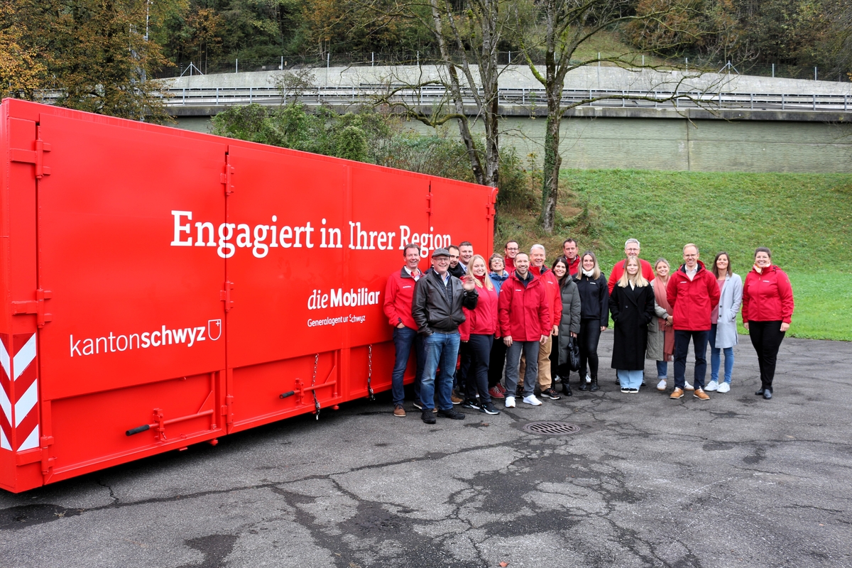 Jetzt erhält der Kanton Schwyz von der Mobiliar ein zusätzliches Mittel gegen Hochwasser: ein mobiles Hochwasserschutzsystem. Es besteht aus einem Container, welcher 400 Meter lange, orange Deichelemente und sämtliches zu deren Einsatz notwendige Zubehör enthält. Damit können die Feuerwehren lokal und rasch unterstützen, wo ohne oder selbst mit baulichen Massnahmen kein ausreichender Hochwasserschutz besteht. Die Übergabe fand am 25. Oktober auf der Übungsanlage für Feuerwehr und Zivilschutz in Seewen statt. Dort demonstrierte die Feuerwehr Schwyz, wie rasch und punktuell der mobile Hochwasserschutz aufgestellt werden kann.