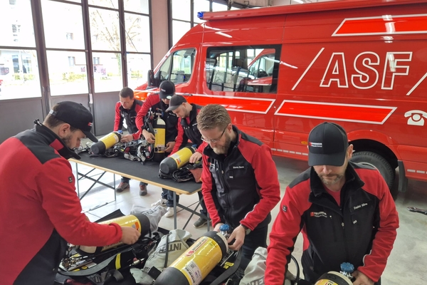 Bei einem weiteren Posten wurde der Umbau von Einflaschen- auf Zweiflaschenatemschutzgeräte trainiert.