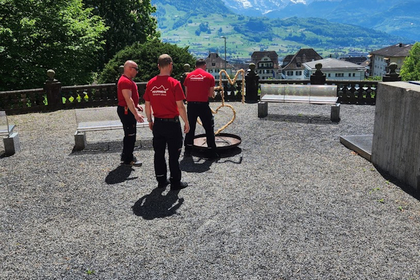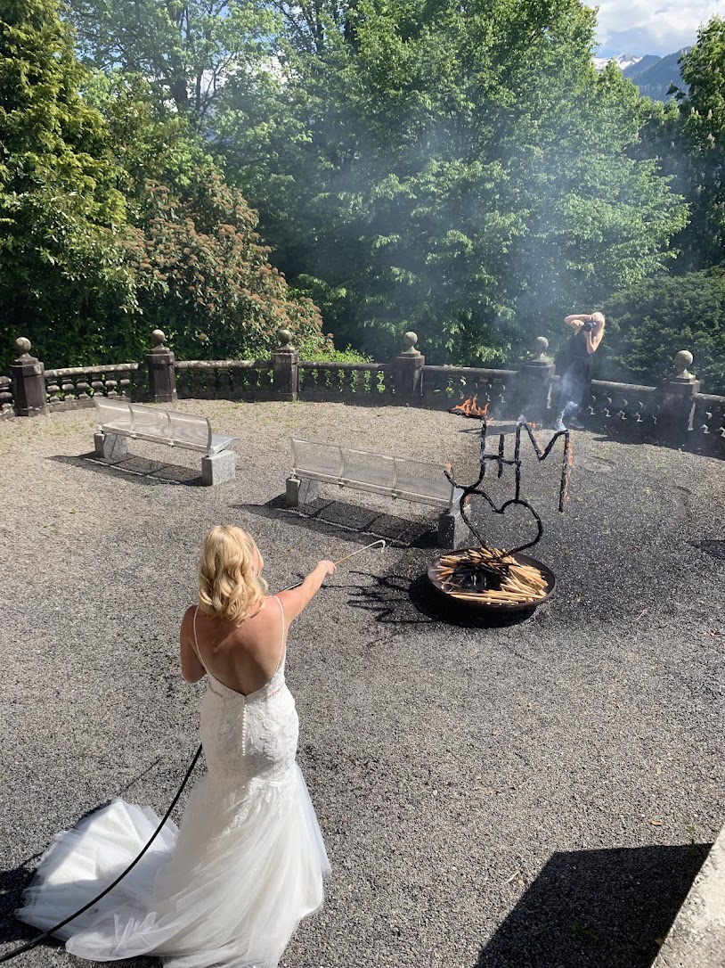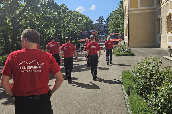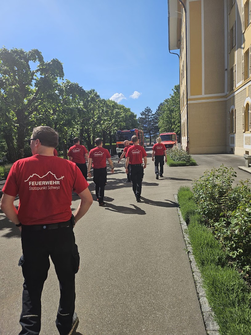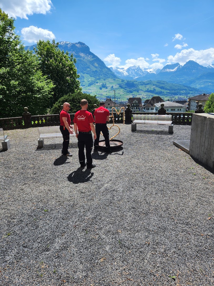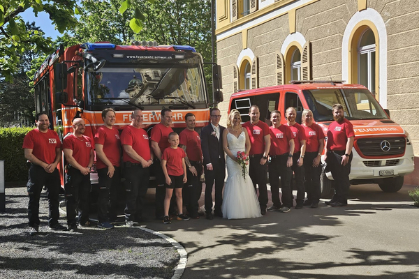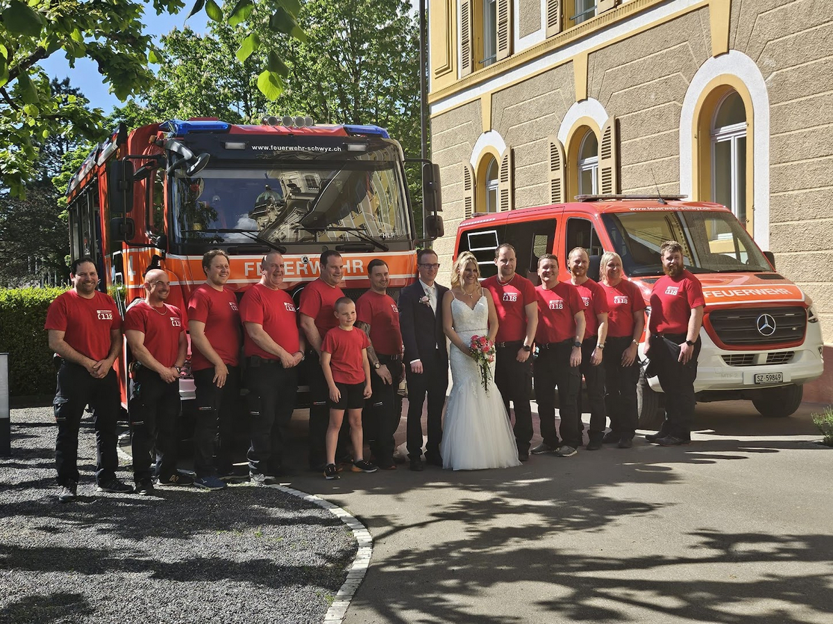Extra für diesen Freudentag wurde ein brennendes Herz für das Hochzeitspaar geschmiedet. Mit diesem Symbol der Liebe, begleitet mit den Martinshörnern vom HLF und MTF2, sowie mit dem traditionellen Schlauchring, wurde Michael und seine Jasmin bei der Kirche im Kollegium in Schwyz überrascht.