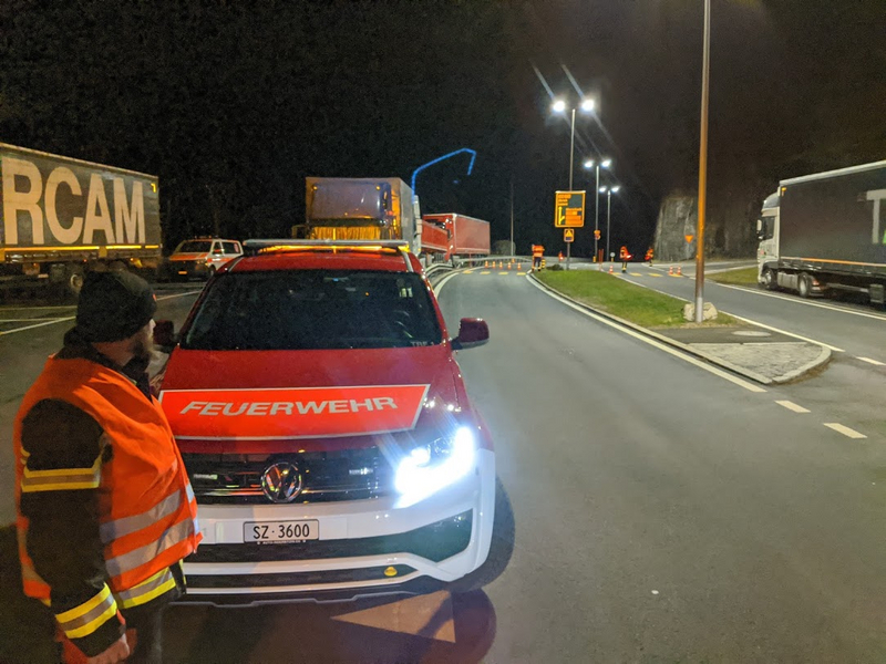 | Ablauf | - Strasse gesperrt und Verkehr gewendet - weitere Sperrungen in Absprache mit Kapo Schwyz - Sperren aufgehoben und Strasse wieder dem Verkehr übergeben - keine weiteren Massnahmen |